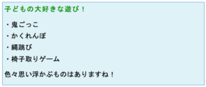では次に、幼稚園や保育園などで子どもに人気の遊びについて見ていきましょう。
